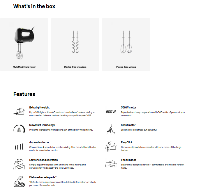 Up to 20% lighter than AC motored hand mixers*, the new MultiMix 2 combines simplicity with a powerful 500 W DC motor and a sleek metal faceplate that adds a design-touch. And thanks to SlowStart Technology that prevents messy splashes, you can create doughs, batters and cream without having to clean up the countertop.
