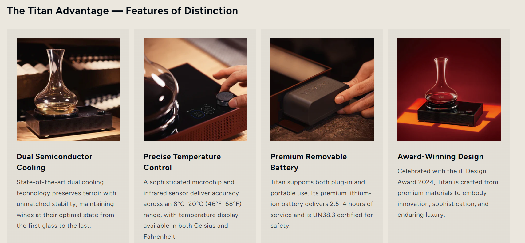 With its refined, tech-inspired design, Titan is the ultimate accessory for connoisseurs. The crafted decanter enhances bouquet and texture, while the cooling plate preserves perfect serving temperature — transforming every pour into an expression of elegance.